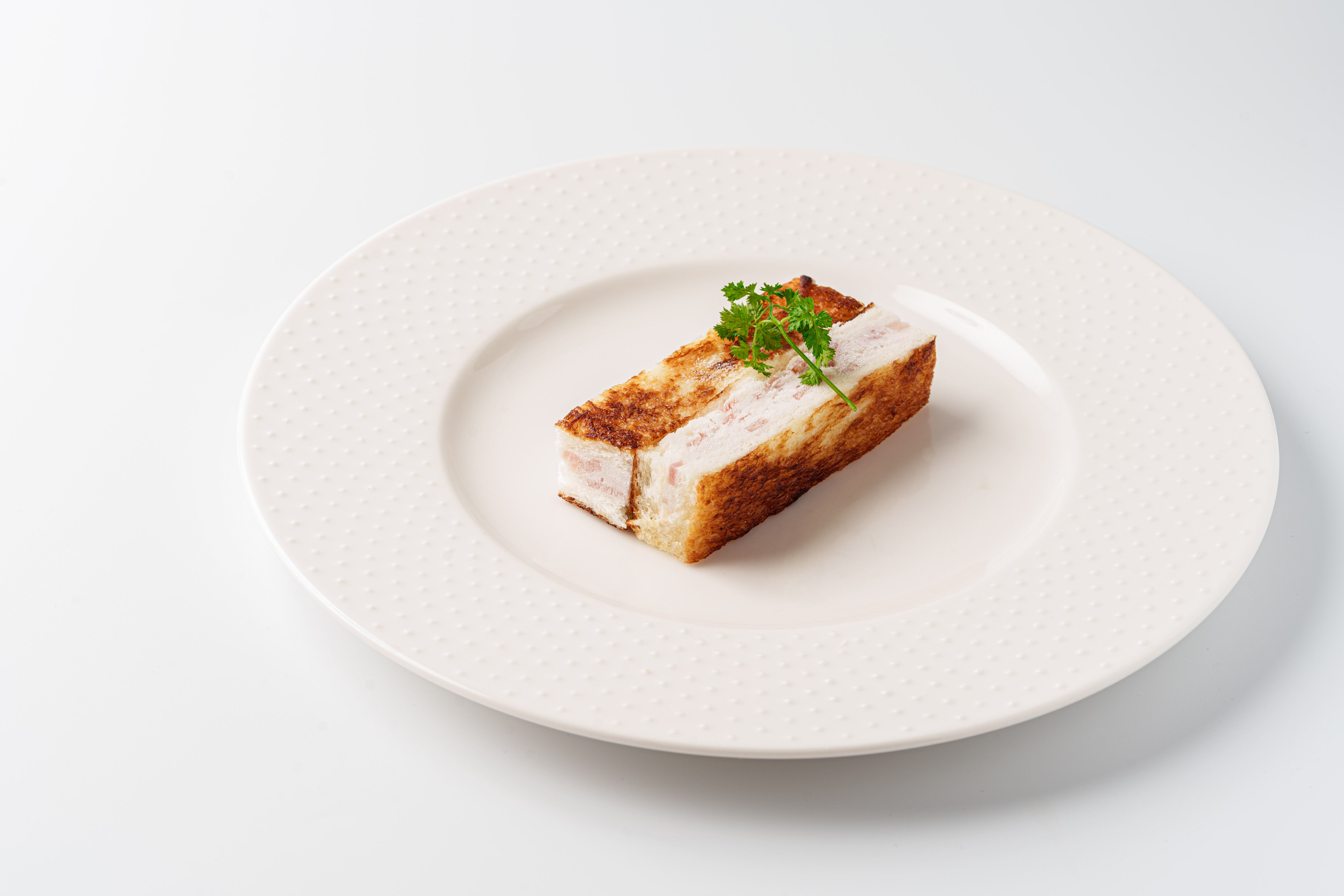 クリーム、チーズ、ハムを加えたソースを食パンに挟み、表面を焦がしバターでこんがり焼き上げたクロックムッシュです!お好みの大きさにカットしてお召し上がりください。
